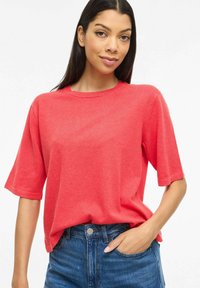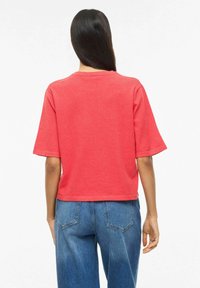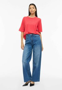 Sieviete stāv ar roku kabatā, tērpusies sarkanā īssleju kreklā un zilās augsta jostasvietas džinsās, baltā fona priekšā.