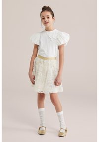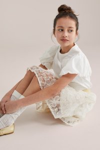 Bērns valkā baltu mežģīņu svārku ar zelta jostu, baltas rakstainas zeķes un zelta Mary Jane kurpes stāv uz bēša grīdas.