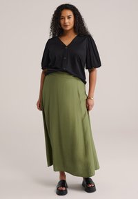 Sieviete ar cirtainiem matiem, nēsājot zelta riņķa auskarus, melnu blūzi ar pūstā piedurkņu pogām un olīvu zaļu svārku, stāvot pret vienkāršu fonu.
