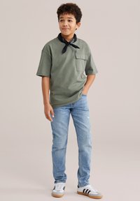Zēns stāv ar roku kabatā, valkājot zaļu T-kreklu, zilas džinsas, baltus sporta apavus un melnu kaklasaiti uz vienkārša fona.