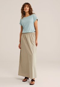 Sieviete ar viļņainiem brūniem matiem, tērpusies gaiši zilā teksturētā īsroku krekliņā, ielikusi vienu roku biksu kabatā, valkājot bēša krāsas svārkus ar elastīgu jostasvietu.