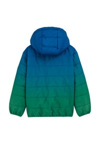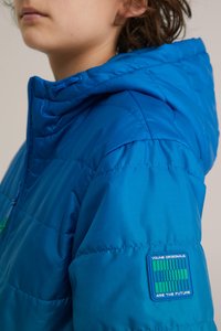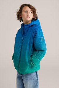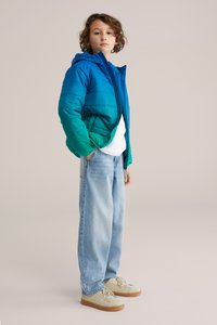 Bērns ar cirtainiem matiem, ģērbies zilgani zaļā pūkainā jakā, baltā kreklā, gaiši zilās džinsās un bēšās sporta kurpēs, stāv uz bēša fona.