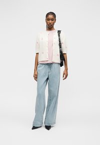 Sieviete ar pītiem matiem, tērpusies baltā kardiganā ar rozā rakstiem, valkājot gaiši rozā kreklu un gaiši zilas džinsas.