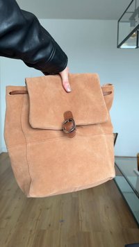 Tēva zamšveidīga plecu soma ar nolocamu atloku, brūna ādas akcenti un sudraba aparatūras gredzens. Iespējota saites aizvēršana un mīksts tekstūrs.
