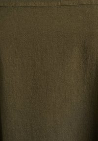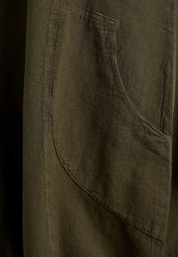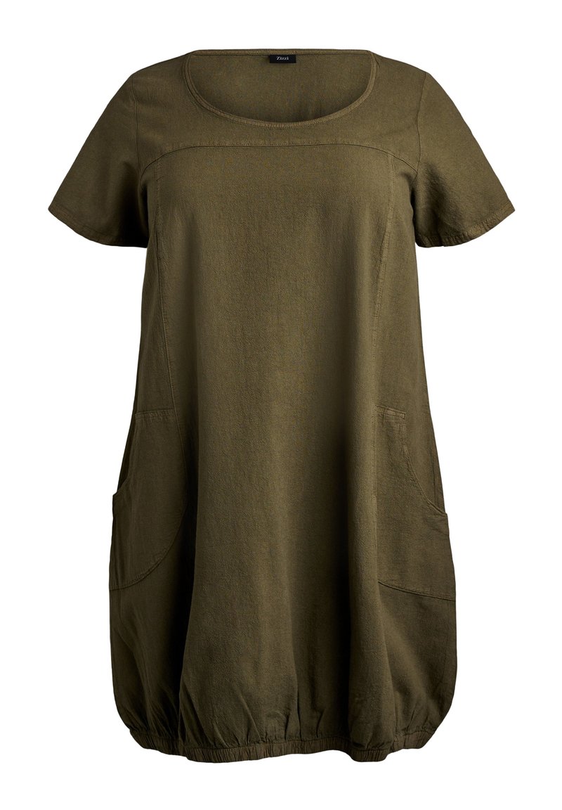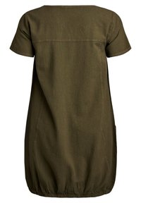Īss olīvu zaļš kleita ar apaļu izgriezumu, brīvs siluets, divas sānu kabatas un savākta apakšmala.